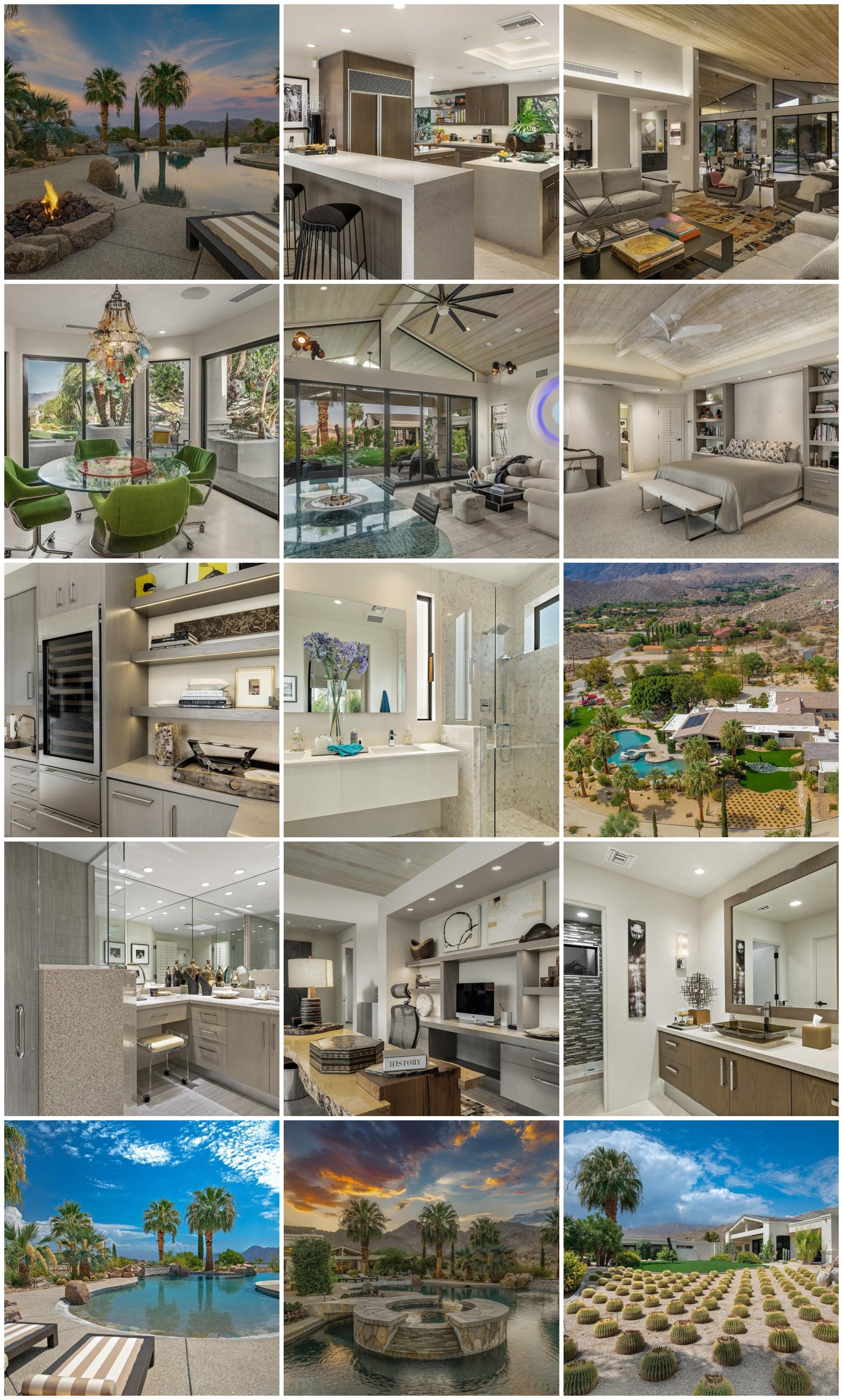 Welcome to Paradis, enter through private gates and park like grounds. Breathtaking views and artful cosmopolitan design ignite your senses. Reimagined for a luxurious desert lifestyle, with over 6,000-SF of flowing interior living space, stunning artful contemporary design just begin to describe this Five-Acre property. Through walls of glass, inside and outside are one, custom finishes and varying ceiling elevations capture you. Step outside to private resort-style patios and grounds and multiple sitting areas, unbelievable beach entry pool, elevated waterfall spa and sustainable desert landscaping. Stone walkway spotlights resort style grounds and Art while you walk to your newly-built luxury guest house with kitchen and Three-bedrooms. Entertain family and friends in relaxed intimate occasions or soiree with hundreds. This one-of-a-kind property offers many personal and social possibilities, five minutes from world-class El Paseo shopping, dining and entertainment. Call Nyla Patzner for a private showing, 415.341.3426.